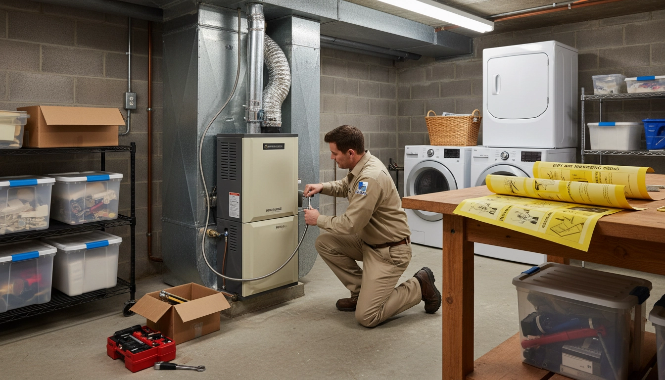 HVAC technician installing whole‑house humidifier in basement utility room